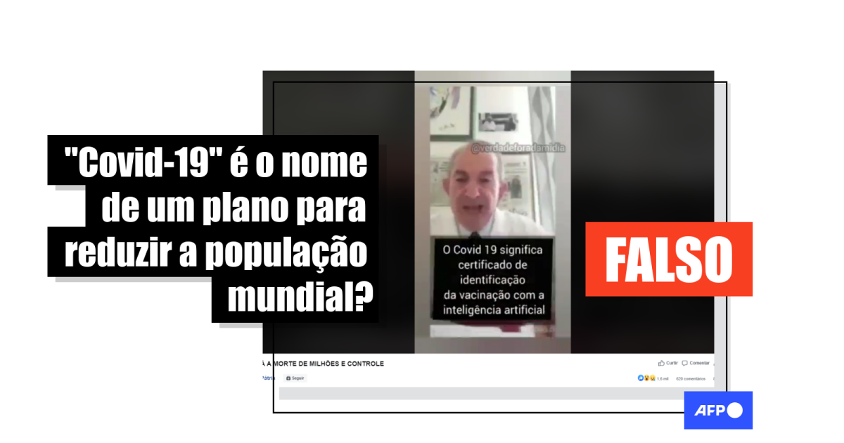 No início do vídeo, Petrella assegura que covid-19 significa “certificado de identificação de vacinação com a inteligência artificial” e que o número 19 representa o “o ano em que ele foi criado”. Também afirma que a covid-19 “não é o nome do vírus”, mas de um “plano internacional de controle e de redução da população”.