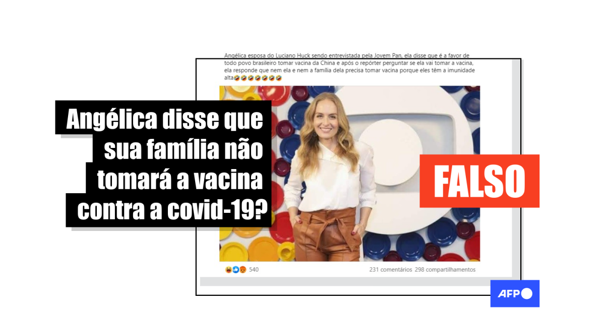 “Angélica esposa do Luciano Huck sendo entrevistada pela Jovem Pan Ela disse que é a favor de todo povo brasileiro toma vacina da China o repórter perguntou se ela tem coragem de tomar a vacina ela disse que nem ela e nem a família dela precisa tomar vacina porque eles têm a imunidade alta”, diz o texto compartilhado mais de 3.500 vezes no Facebook (1, 2, 3) desde o último dia 18 de janeiro.