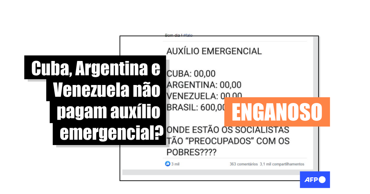 “Auxílio Emergencial. Cuba: 00,00. Argentina: 00,00. Venezuela: 00,00. Brasil: 600,00. Onde estão os socialistas tão ‘preocupados’ com os pobres????”, diz o texto compartilhado mais de 6.500 vezes no Facebook (1, 2, 3, 4) ao menos desde o último dia 9 de setembro.