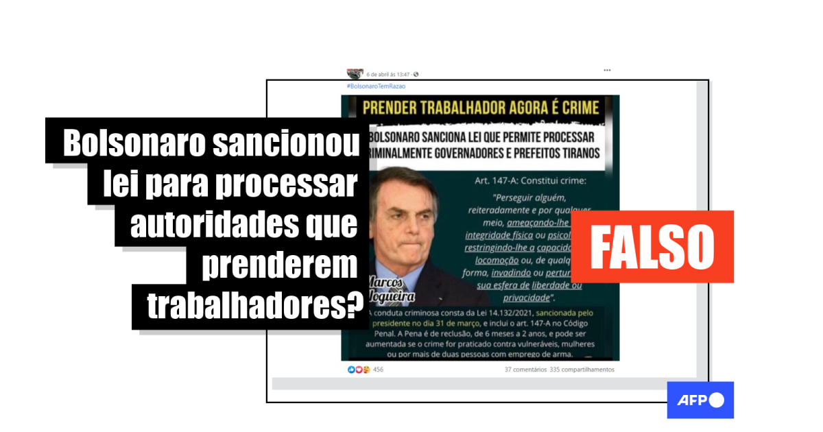 O artigo citado nas redes realmente foi sancionado pelo presidente Jair Bolsonaro no último dia 1º de abril, mas não para coibir este tipo de ação.