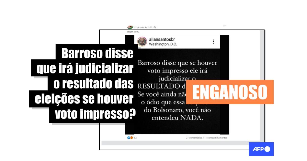 A alegação viralizada nas redes sociais parece ter sido desencadeada pela formulação utilizada por Barroso para explicar essa mesma situação à rádio CBN, em uma entrevista publicada no último dia 21. Ao veículo, Barroso afirmou que se o voto impresso for implementado no Brasil, “nós vamos judicializar o resultado das eleições”.