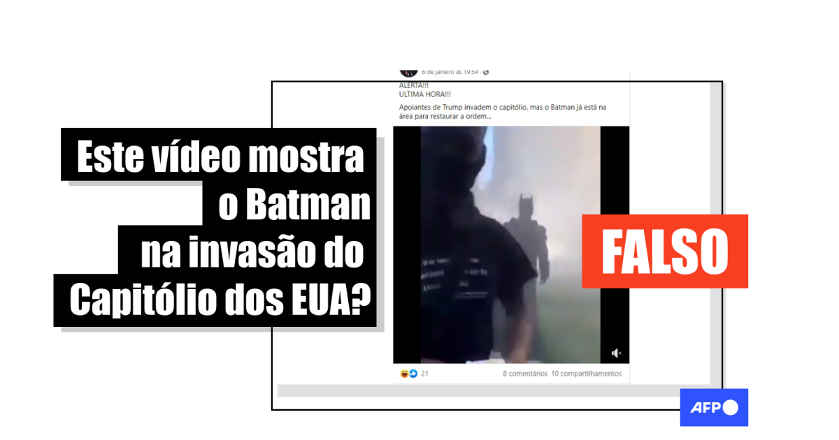 “ALERTA!!! ÚLTIMA HORA!!! Apoiadores de Trump invadem o capitólio, mas o Batman já está na área para restaurar a ordem...”, diz a legenda irônica de uma das postagens (1, 2, 3) do Facebook, que foram visualizadas mais de 9.000 vezes. Todas anexam um vídeo no qual a câmera acompanha um homem disfarçado de Batman caminhando entre os manifestantes, em meio à fumaça e a um forte alvoroço.