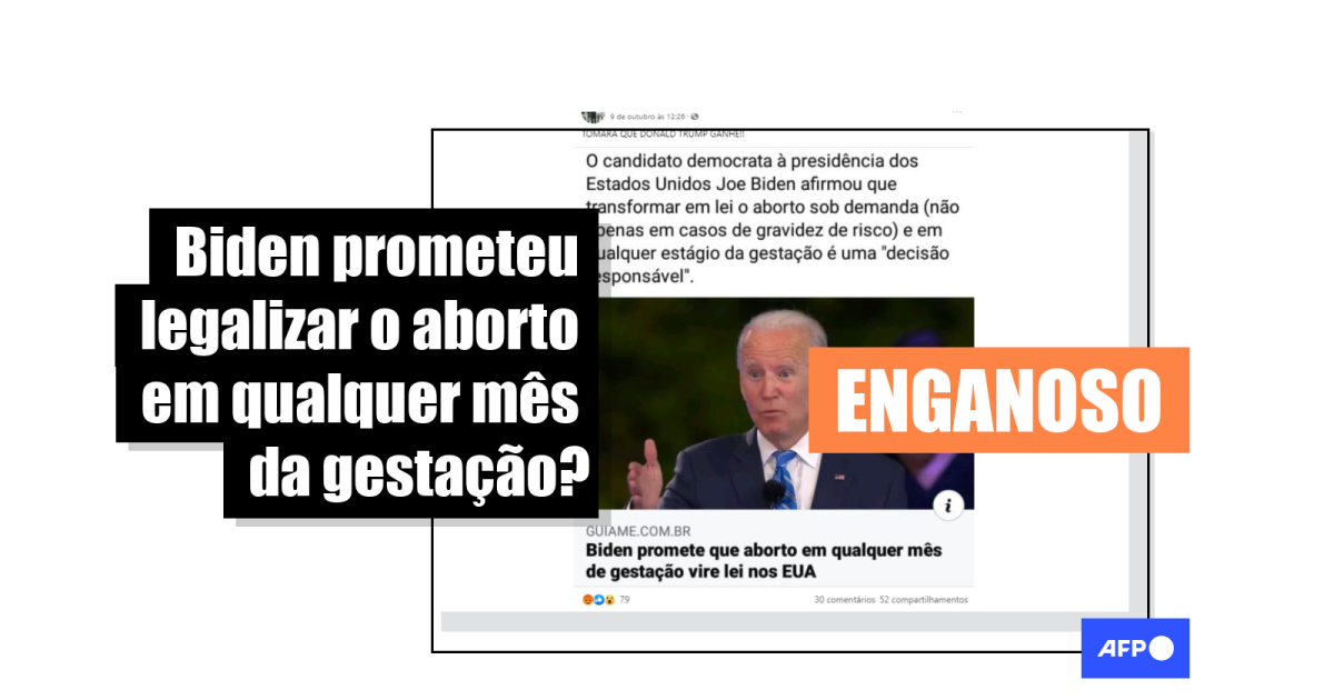“Biden promete que aborto em qualquer mês de gestação vire lei nos EUA”, diz o título do artigo de um site de informação cristã, compartilhado mais de 1.900 vezes no Facebook, segundo a ferramenta de monitoramento CrowdTangle.