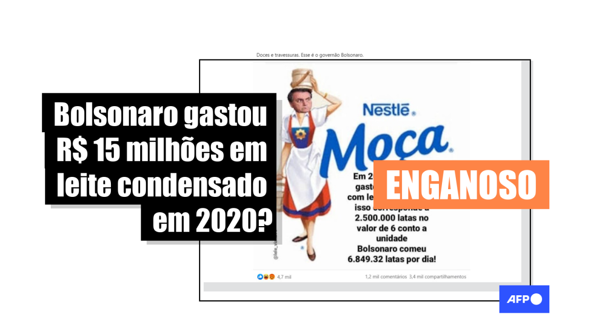 “Em 2020 Bolsonaro gastou 15 milhões com leite condensado, isso corresponde a 2.500.000 latas no valor de 6 conto a unidade. Bolsonaro comeu 6.849.32 latas por dia!”, diz o texto replicado mais de 4 mil vezes no Facebook (1, 2, 3) e no Instagram desde o último dia 26 de janeiro.