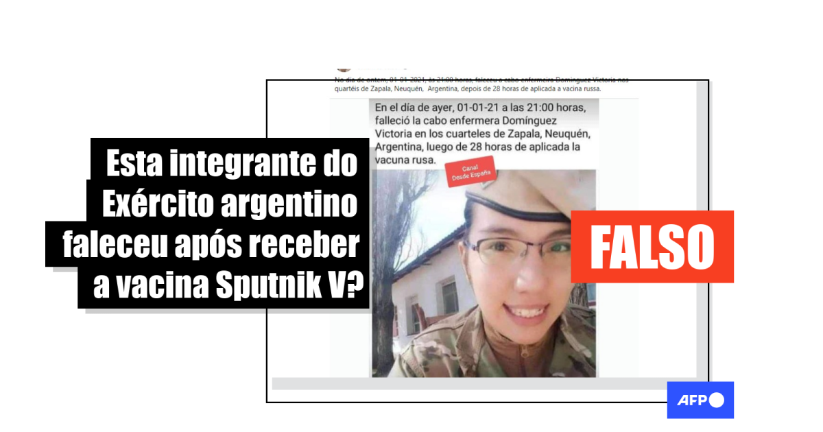 “No dia de ontem, 01-01-2021, às 21:00 horas, faleceu a cabo enfermeira Dominguez Victoria nos quartéis de Zapala, Neuquén, Argentina, depois de 28 horas de aplicada a vacina russa”, garantem publicações compartilhadas dezenas de vezes no Facebook (1, 2, 3) e Twitter (1, 2, 3), junto a uma imagem de uma mulher com um uniforme militar.