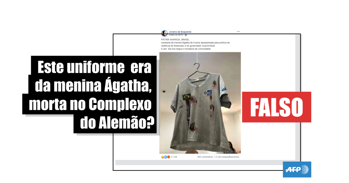 “Pátria Amarga, Brasil. Camiseta da menina Ágatha de 8 anos assassinada pela política de violência de Bolsonaro e do governador AuschWitzel. E, sim. Ela era negra e moradora de comunidade”, diz uma das publicações, compartilhada mais de mil vezes desde 21 de setembro.