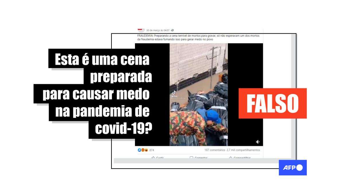 “Preparando a cena terrível de mortos para gravar e gerar medo na população. Só não esperavam um dos mortos da fraudemia fumando…”, diz uma das publicações compartilhadas no Facebook (1, 2, 3), no Instagram (1, 2) e no Twitter (1, 2).