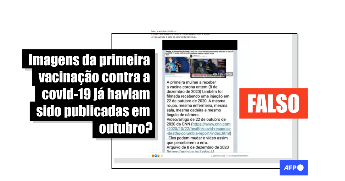 “A primeira mulher a receber a vacina corona ontem (8 de dezembro de 2020) também foi filmada recebendo uma injeção em 22 de outubro de 2020. A mesma roupa, mesma enfermeira, mesma sala, mesma cadeira e mesmo ângulo da câmera”, diz o texto replicado em múltiplas publicações no Facebook (1, 2, 3) e Twitter.