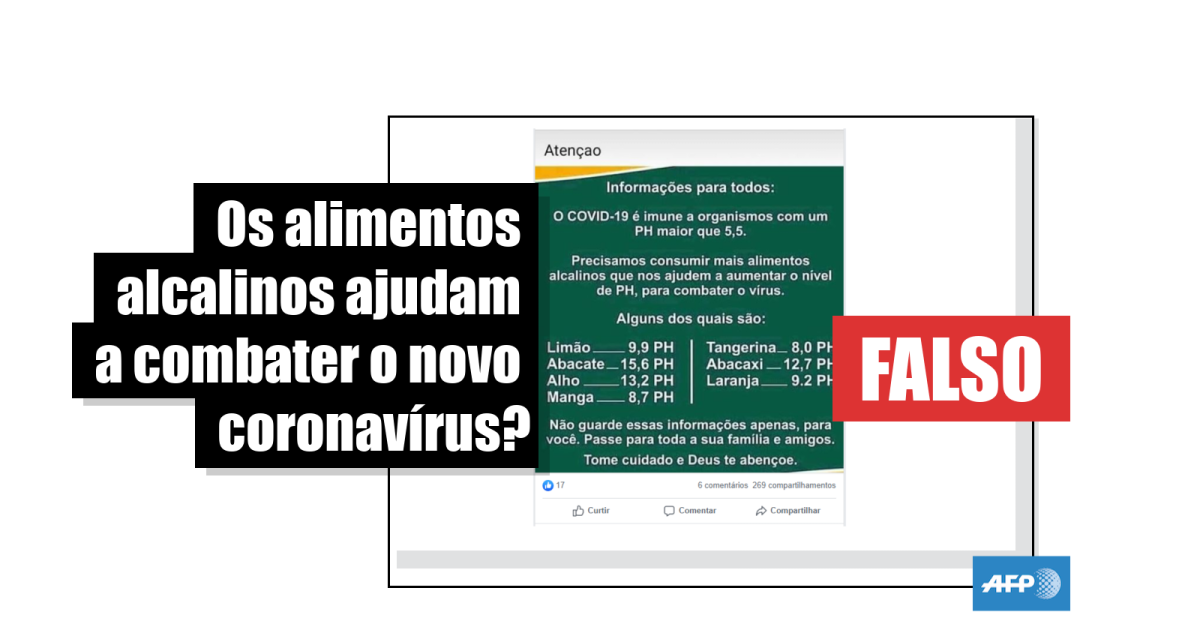 “O COVID-19 é imune a organismos com um PH maior que 5,5. Precisamos consumir mais alimentos alcalinos que nos ajudem a aumentar o nível de PH, para combater o vírus. Alguns dos quais são: Limão - 9,9 PH, Abacate - 15,6 PH, Alho - 13,2 PH, Manga - 8,7 PH, Tangerina - 8,0 PH, Abacaxi - 12,7 PH, Laranja - 9,2 PH. Não guarde essa informação apenas, para você. Passe para toda a sua família e amigos. Tome cuidado e Deus te abençoe [sic]”, diz o texto de uma imagem publicada no último dia 22 de abril e compartilhada centenas de vezes no Facebook. Uma série de outras postagens (1, 2, 3) também circulou nesta rede social e no Instagram.