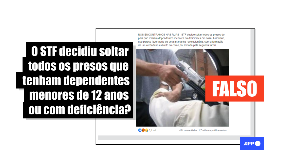 “STF soltando geral! STF libera prisão domiciliar a todos os detentos do Brasil que tenham filhos menores” e “STF decide soltar todos os presos do país que tenham dependentes menores ou deficientes em casa. A decisão, que parece fazer parte de uma artimanha revolucionária, com a formação de um verdadeiro exército do crime, foi tomada pela segunda turma”, são algumas das alegações que circulam em publicações no Facebook (1, 2), compartilhadas milhares de vezes.