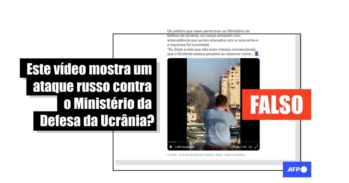 “Os prédios que caem pertencem ao Ministério da Defesa da Ucrânia, os russos avisaram com antecedência que seriam atacados com a nova arma”, dizem as publicações compartilhadas no Twitter, no Facebook e no TikTok.