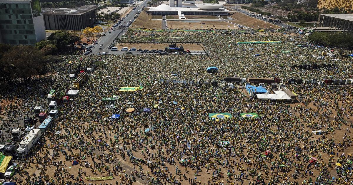 Nas imagens, é vista uma multidão de pessoas vestidas de verde e amarelo em meio a bandeiras do Brasil na Esplanada dos Ministérios, em Brasília. Nos vídeos mais longos, a partir de 1 minuto e 39 segundos, o presidente Jair Bolsonaro pode ser ouvido discursando sobre um carro de som.