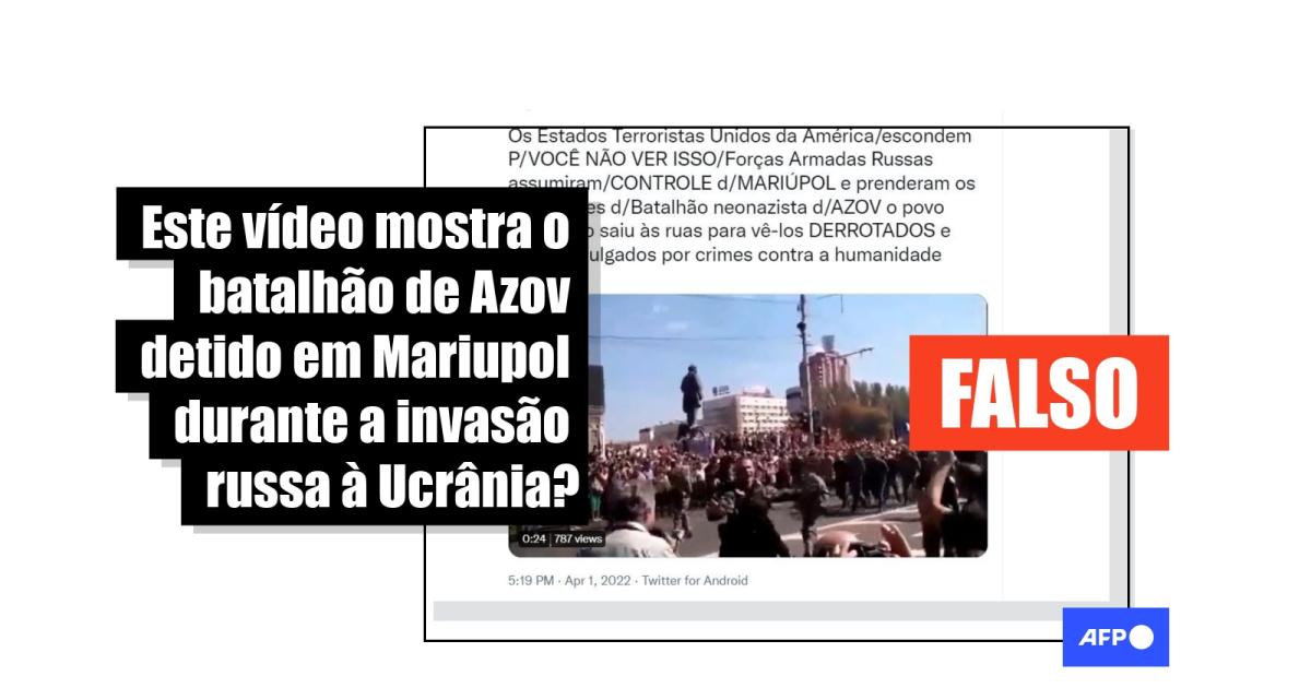 “Os Estados Terroristas Unidos da América/escondem P/VOCÊ NÃO VER ISSO/Forças Armadas Russas assumiram/CONTROLE d/MARIÚPOL e prenderam os integrantes d/Batalhão neonazista d/AZOV o povo ucraniano saiu às ruas para vê-los DERROTADOS e p/serem julgados por crimes contra a humanidade”, diz uma das publicações compartilhadas no Twitter (1) e no Facebook.