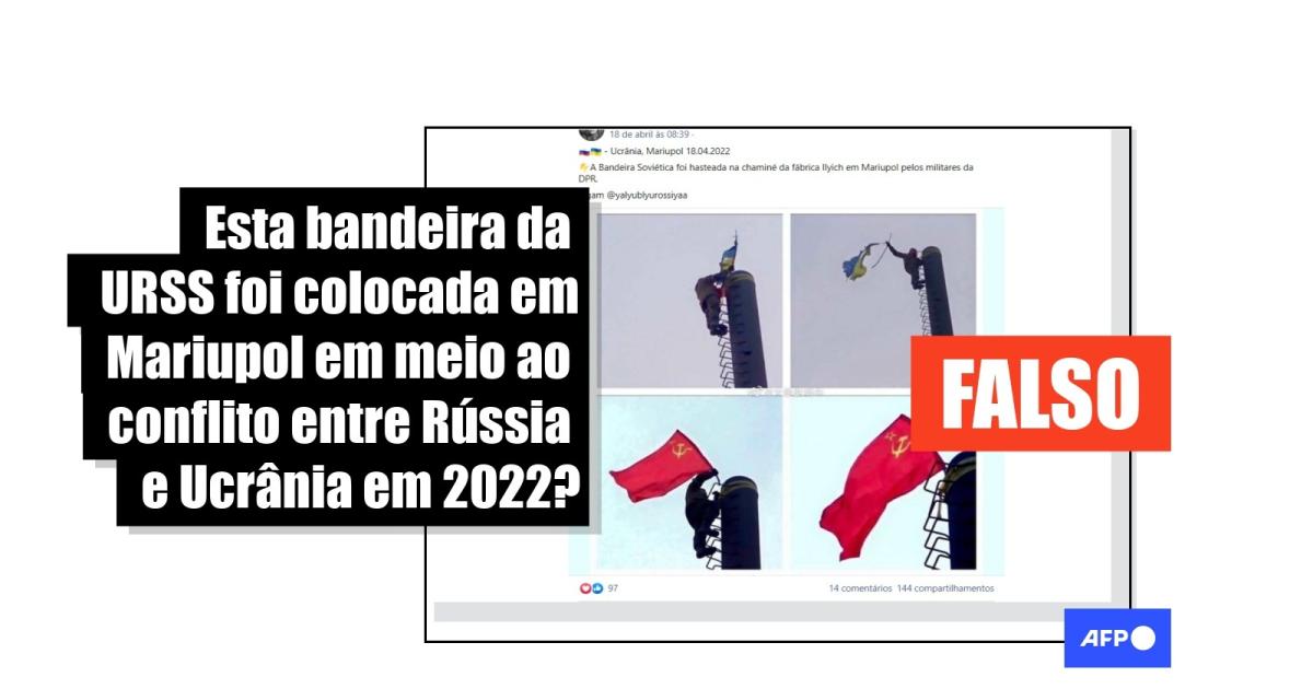 “Ucrânia, Mariupol 18.04.2022 A Bandeira Soviética foi hasteada na chaminé da fábrica Ilyich em Mariupol pelos militares da DPR” e “Em uma área recém ocupada em Mariupol, um soldado russo é visto aqui retirando a bandeira da Ucrânia e substituindo-a pela bandeira da Rússia. Não! Espera!”, são algumas das legendas que acompanham as fotos em publicações no Facebook (1, 2), Instagram (1, 2) e Twitter (1, 2).