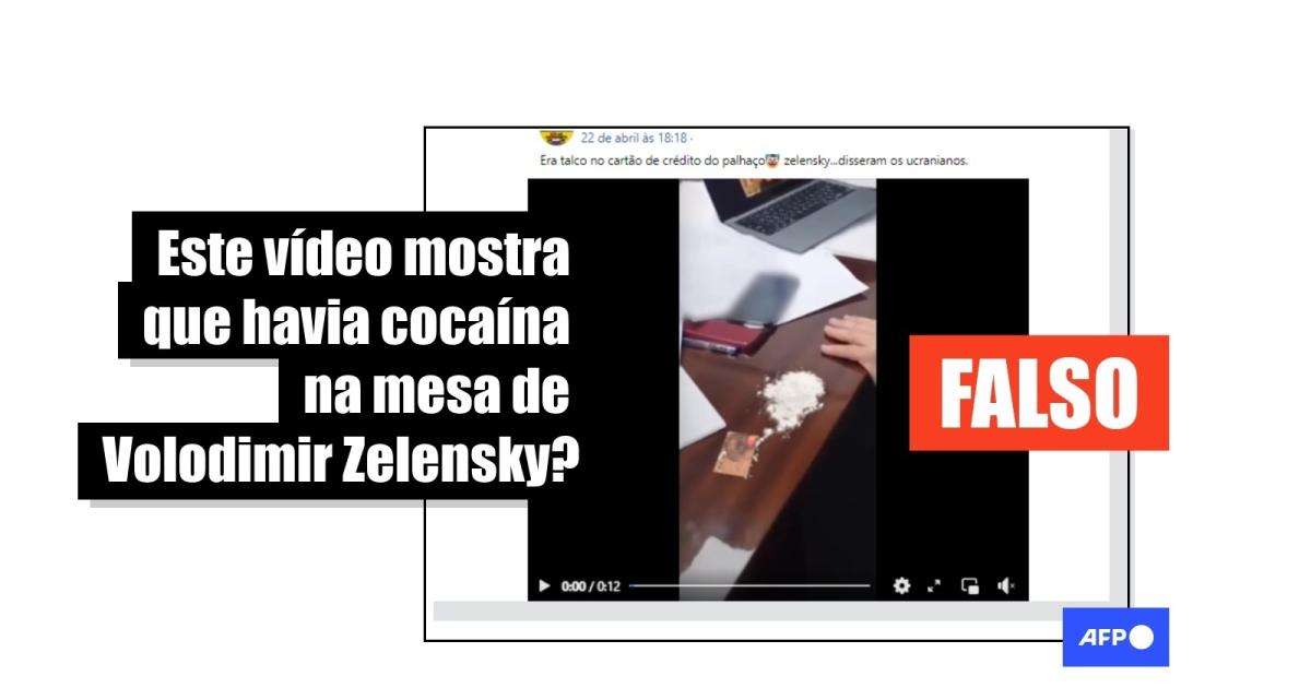 Mas a gravação viralizada é, na realidade, uma montagem. O pó branco e o cartão bancário vistos na imagem foram adicionados após a cena ser registrada, ao comparar com o vídeo original, encontrado nas redes sociais do presidente ucraniano.