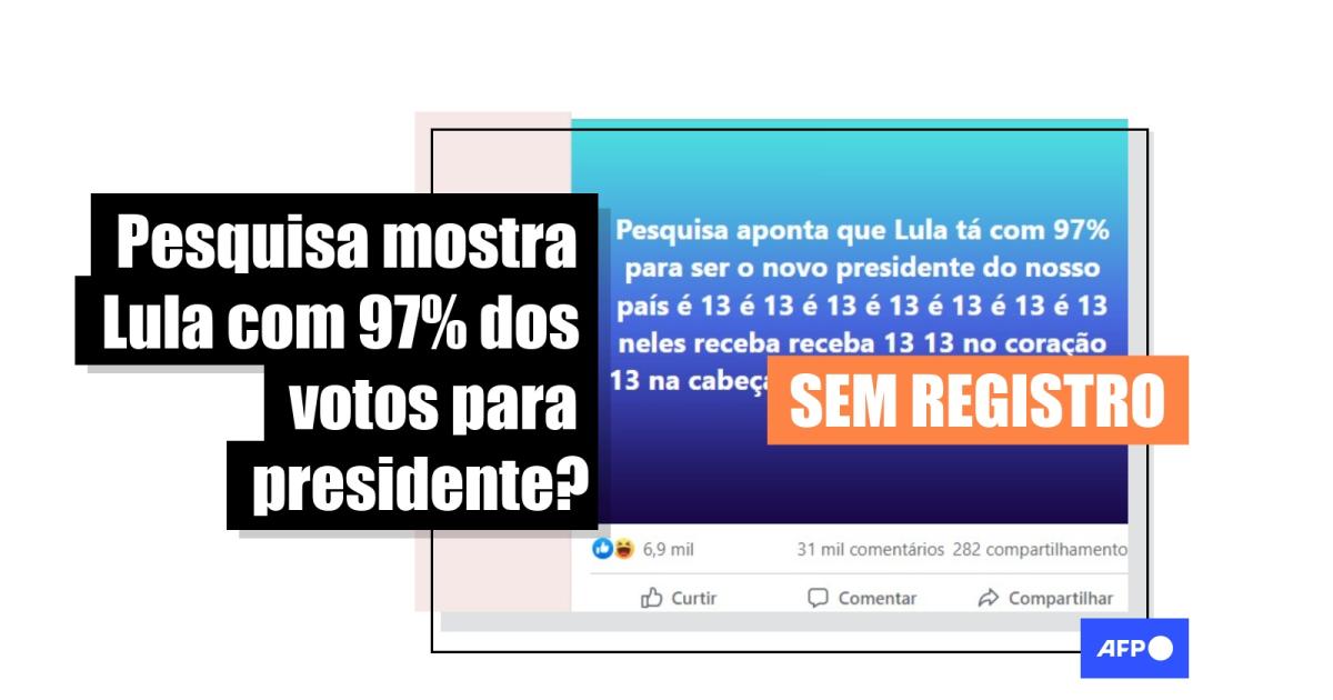 “Pesquisa aponta que Lula tá com 97% para ser o novo presidente do nosso país”, dizem as publicações compartilhadas no Facebook (1, 2, 3). Alegações semelhantes circulam no Twitter.