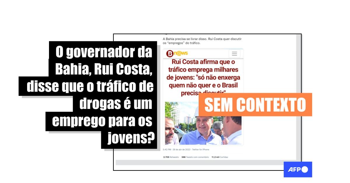 Algumas postagens usam como ilustração a captura de tela de uma matéria publicada no site BNews intitulada “Rui Costa afirma que o tráfico emprega milhares de jovens: ‘só não enxerga quem não quer e o Brasil precisa discutir’”.