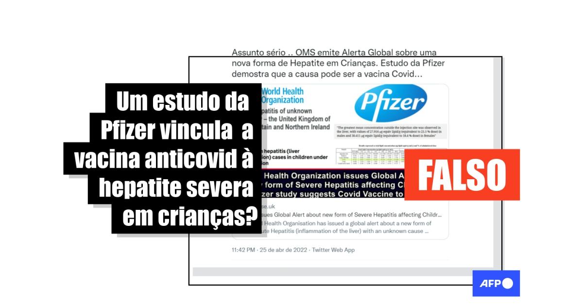 “Assunto sério .. OMS emite Alerta Global sobre uma nova forma de Hepatite em Crianças. Estudo da Pfizer demostra que a causa pode ser a vacina Covid…”, diz uma das publicações compartilhadas no Twitter (1, 2), junto ao link de um artigo em inglês do site The Exposé, já verificado em outras ocasiões pela AFP (1, 2, 3).
