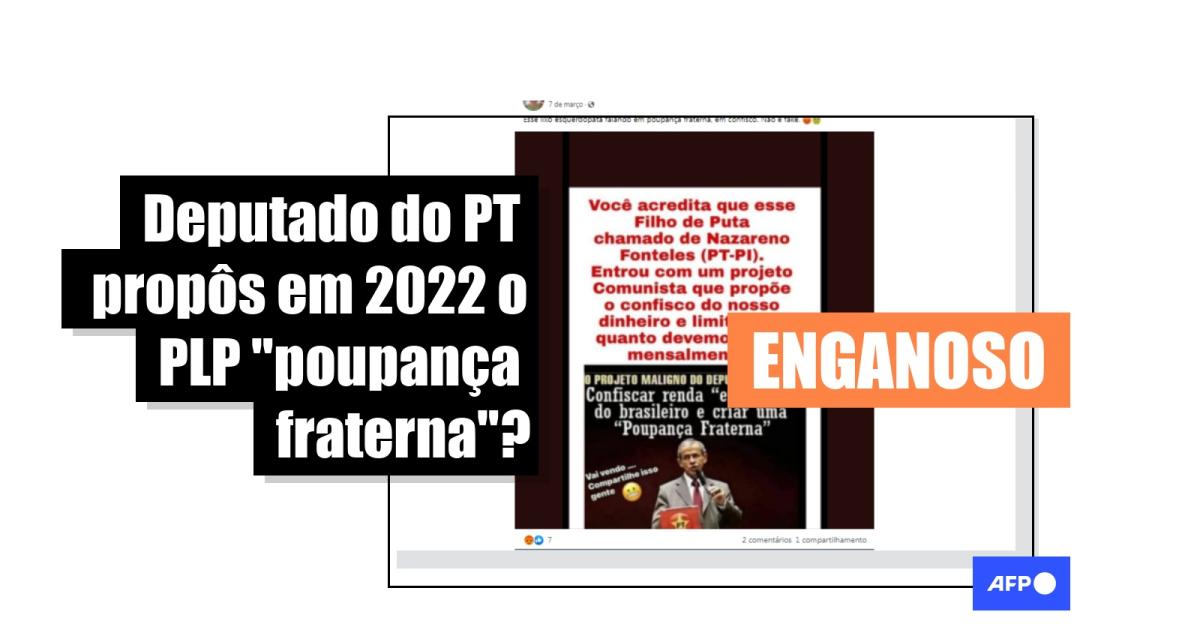 E continua: “O PROJETO MALIGNO DO DEPUTADO PETISTA. Confiscar renda ‘excedente’ do brasileiro e criar uma ‘Poupança Fraterna’. Projeto do deputado federal Nazareno Fonteles (PT-PI), propõe confiscar poupanças e salários, criando um limite mensal de consumo, e o excedente iria para uma poupança, sendo devolvido no prazo de 7 anos. ESSE PARTIDO É UMA PRAGA NO BRASIL”.