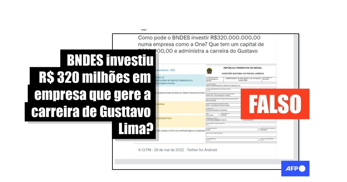 “Como pode o BNDES investir R$320.000.000,00 numa empresa como a One7 Que tem um capital de R$50.000,00 e administra a carreira do Gustavo Lima?”, diz uma das publicações no Twitter (1, 2). Publicações similares circulam no Facebook (1, 2) e no Instagram (1, 2).