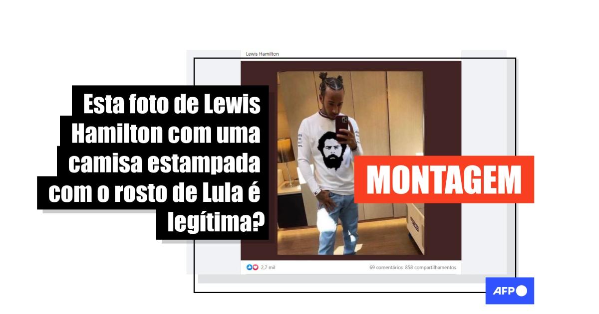 É uma montagem foto em que Lewis Hamilton parece vestir camisa com rosto de Lula