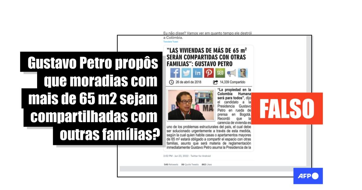 Segundo a imagem, Petro teria apontado - quando era candidato à Presidência nas eleições de 2018 e perdeu para Iván Duque - que um dos problemas estruturais da Colômbia é a "falta de moradia" e que para resolvê-lo, quem mora em casas ou apartamentos maiores de 65 metros quadrados seriam "obrigados a dividir o espaço com outras famílias" durante seu governo.