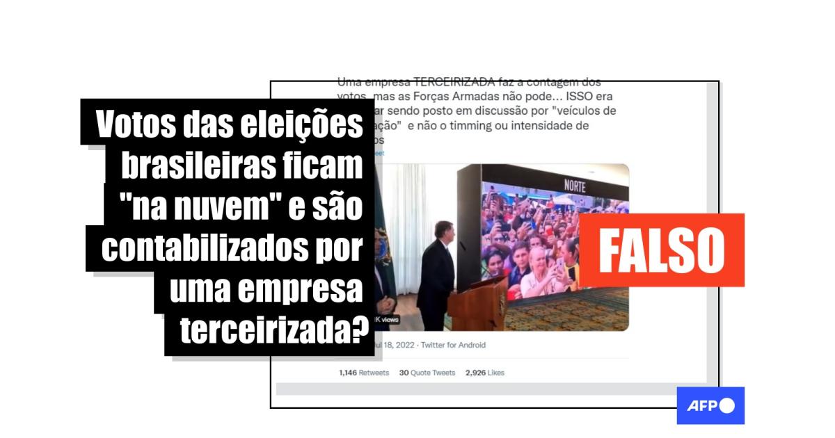 “Uma empresa TERCEIRIZADA faz a contagem dos votos, mas as Forças Armadas não pode…”, diz o trecho de uma das publicações compartilhadas no Twitter (1, 2) e no Facebook. “Quer dizer que os votos é contado por uma nuvem dum super computador terceirizado”, indica outra publicação.