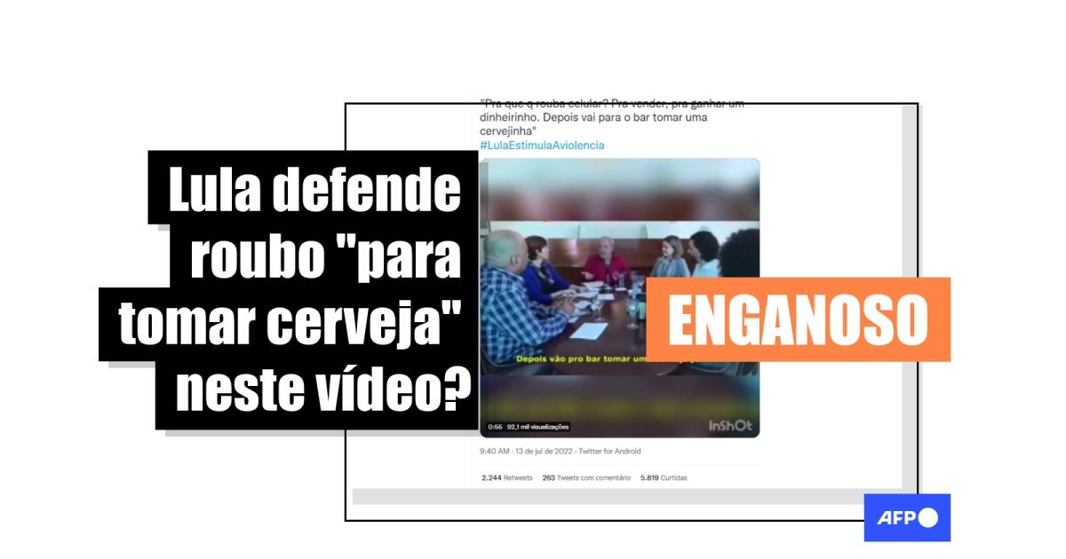 “Eu não posso ver mais jovens de 14, 15 anos assaltando e sendo violentado, assassinado pela polícia", diz Lula em uma versão do conteúdo viral compartilhada no Twitter (1, 2, 3). A sequência é composta por imagens de pessoas cometendo crimes e trechos de reportagens. Em seguida, é exibida a suposta declaração de Lula: “Pra que que rouba celular? Pra vender! Pra ganhar um dinheirinho! Depois vão para o bar tomar uma cerveja juntos”.