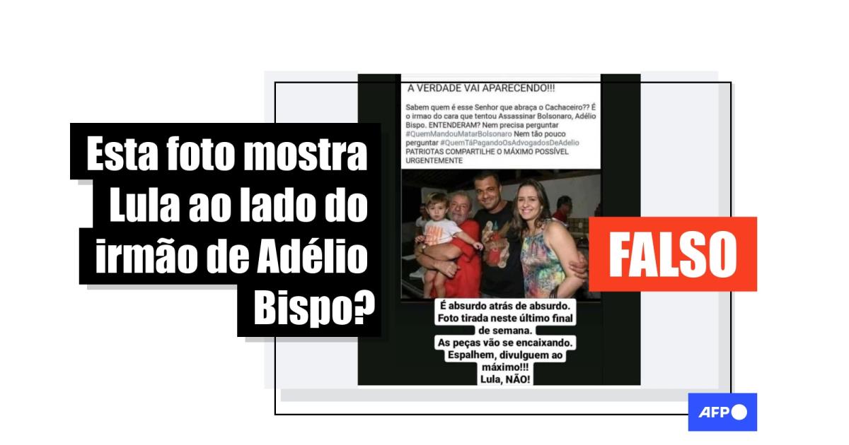 “Sabem quem é esse Senhor que abraça o Cachaceiro?? É o irmao do cara que tentou Assassinar Bolsonaro, Adélio Bispo, ENTENDERAM? Nem precisa perguntar #QuemMandouMatarBolsonaro Nem tão pouco perguntar #QuemTáPagandoOsAdvogadosDeAdelio [sic]”, diz o texto de publicações que acompanham a imagem no Twitter, Facebook, Instagram e Kwai.