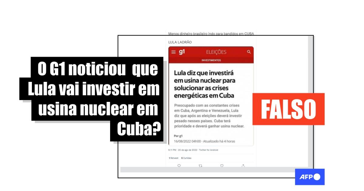No entanto, uma busca no site do G1 não localizou nenhuma matéria com o título “Lula diz que investirá em usina nuclear para solucionar as crises energéticas em Cuba", exibido na imagem compartilhada.