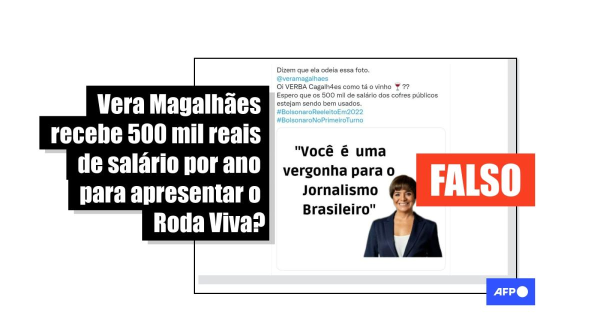 “VERA MAGALHÃES ! A jornalista que ganha 500 mil por ano da fundação sustentada pelo governo de SP. Entendeu ? Doria começou a bancar a jornalista que ataca o presidente em todo o tempo. VAMOS PARAR COM O MI MI MI QUE BOLSONARO É CONTRA AS MULHERES ! A casa caiu Vera !”, escreveu o pastor Silas Malafaia no Twitter. A mesma mensagem circulou também no Facebook (1, 2, 3).