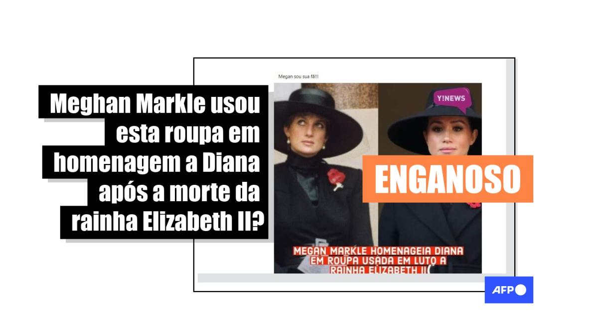 “Megan Markle homenageia Diana em roupa usada em luto a rainha Elizabeth II”, diz o texto compartilhado no Instagram e Facebook, sobreposto a uma imagem que mostra Diana à esquerda e Meghan Markle à direita.