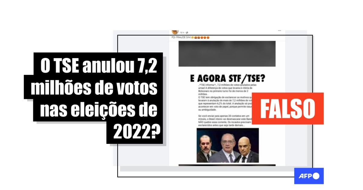 “TSE informa:- 7,2 milhões de votos anulados pelas urnas! A diferença de votos que levaria à vitória de Bolsonaro no primeiro turno foi de menos de 2 milhões”, começa o texto viralizado em uma imagem que circula no Facebook, Instagram, Twitter, TikTok e Helo.