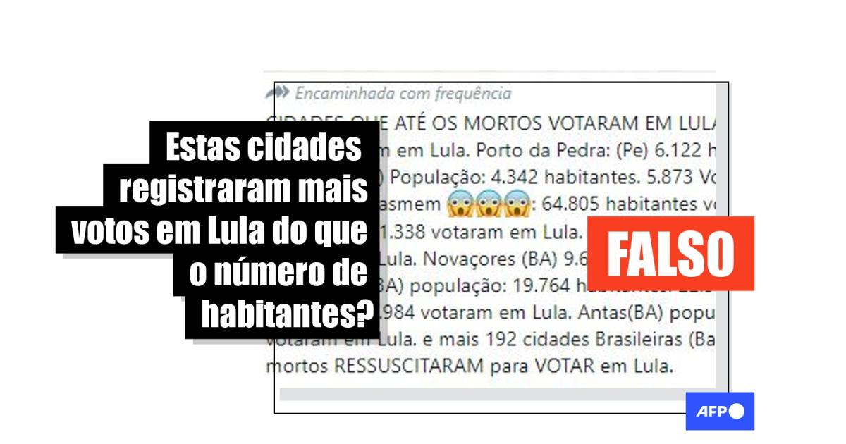 “CIDADES QUE ATÉ OS MORTOS VOTARAM EM LULA”, diz o texto de uma das publicações no Facebook, Telegram e Twitter junto a uma lista de cidades, sua suposta quantidade de habitantes e o número de votos que teriam sido computados para o ex-presidente.
