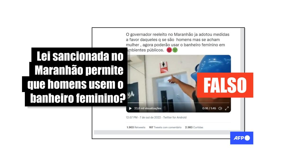 “O governador reeleito no Maranhão ja adotou medidas a favor daqueles q[ue] se são homens mas se acham mulher, agora poderão usar o banheiro feminino em ambientes públicos”, diz uma das publicações que circulam no Twitter, Facebook, Instagram e Kwai junto à sequência.