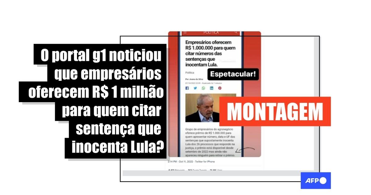 É montagem a "notícia" do g1 sobre prêmio de R$ 1 milhão por sentenças que inocentam Lula