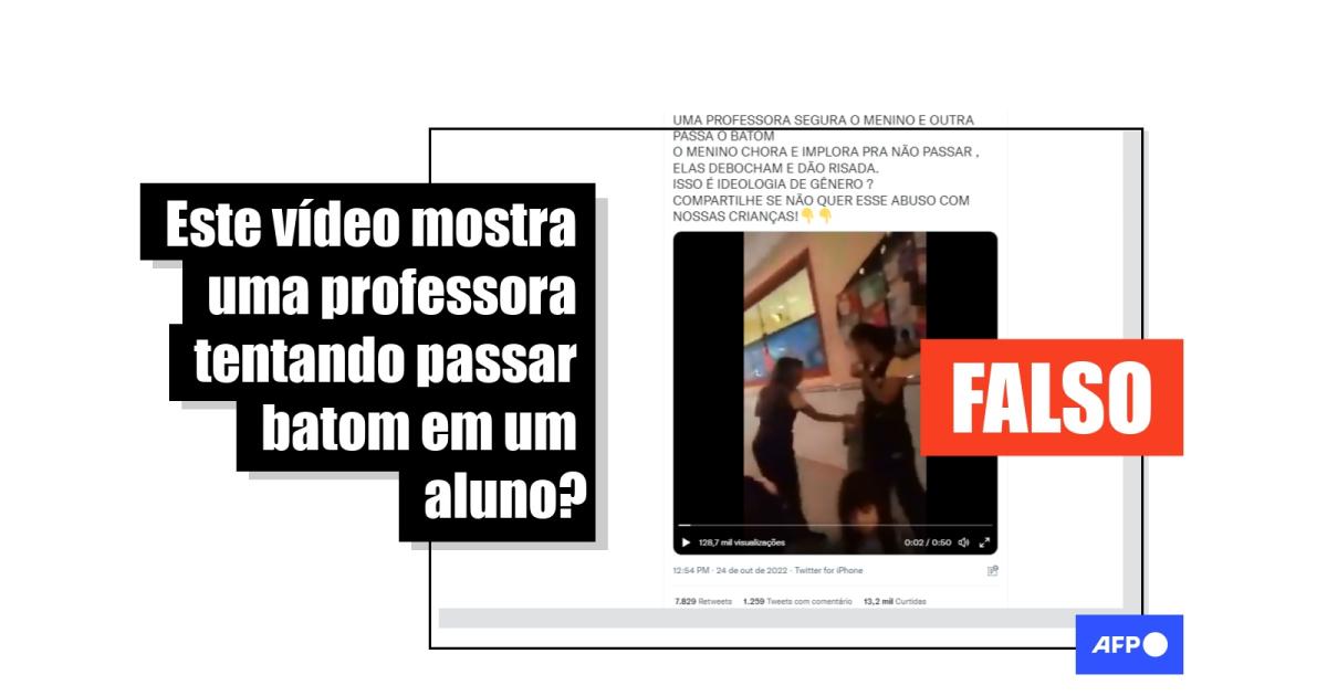 “*ABSURDO!* UMA PROFESSORA SEGURA O MENINO E OUTRA PASSA O BATOM O MENINO CHORA E IMPLORA PRA NÃO PASSAR , ELAS DEBOCHAM E DÃO RISADA. ISSO É IDEOLOGIA DE GÊNERO ? COMPARTILHE SE NÃO QUER ESSE ABUSO COM NOSSAS CRIANÇAS!”, diz uma das publicações feitas no Twitter. O conteúdo também circula no Facebook, TikTok, YouTube, Kwai e Helo.