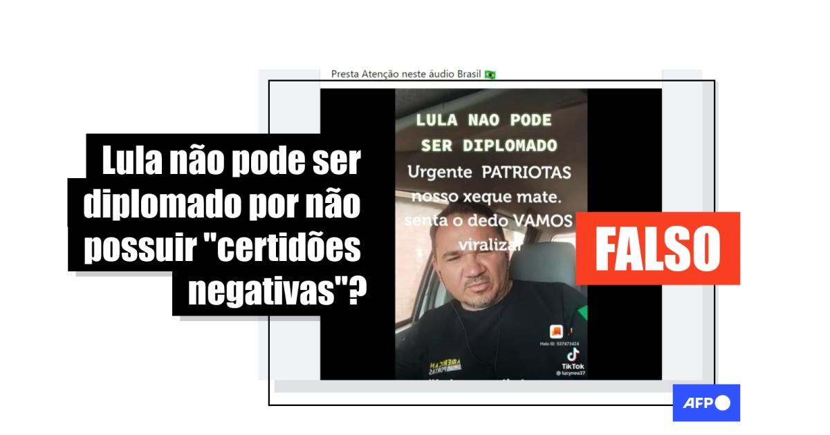 A alegação também circula em forma de texto, com a hashtag “#LulaNãoPodeSerDiplomado”, e foi enviada ao WhatsApp do AFP Checamos, para onde os usuários podem enviar conteúdos vistos em redes sociais, caso duvidem de sua veracidade.
