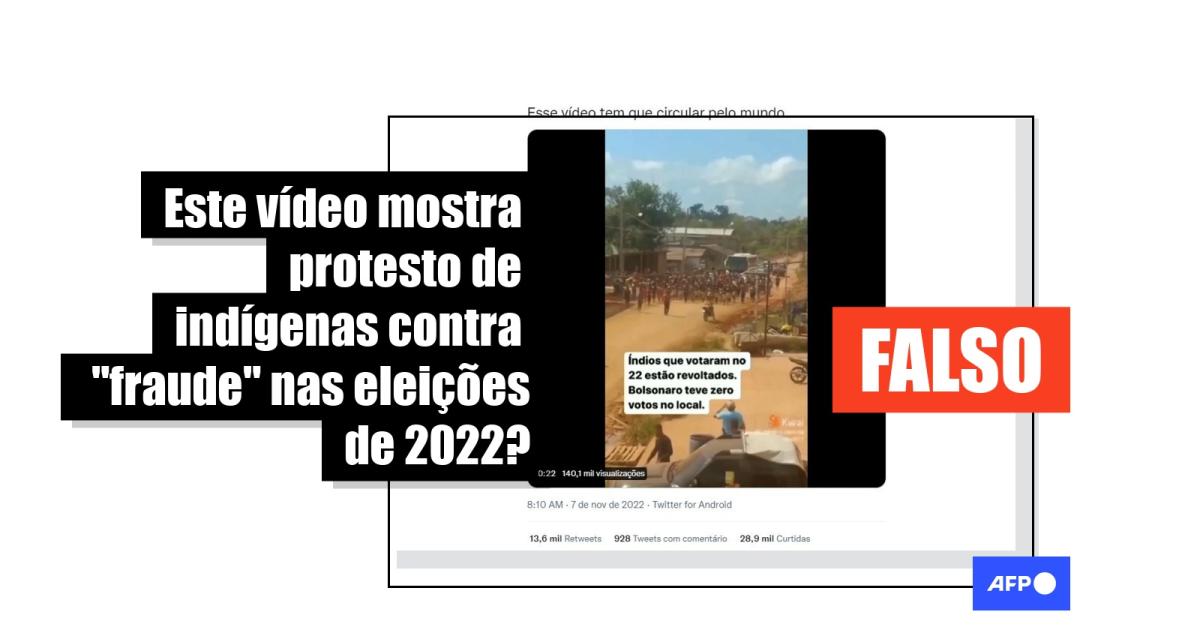 “Índios que votaram no 22 estão revoltados. Bolsonaro teve zero votos no local”, diz o texto sobreposto às imagens compartilhadas no Facebook, Twitter, TikTok e Linkedin. O vídeo também foi enviado ao WhatsApp da AFP Checamos, para onde os usuários podem enviar conteúdos vistos em redes sociais, se duvidarem de sua veracidade.