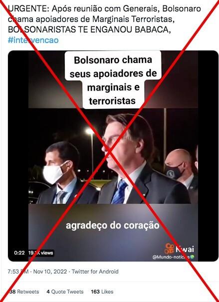"URGENTE: Após reunião com Generais, Bolsonaro chama apoiadores de Marginais Terroristas", diz uma das publicações compartilhadas com um vídeo no Twitter, no Facebook, no TikTok e no Kwai.