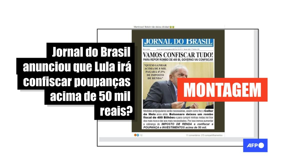 A imagem traz ainda a data da suposta publicação do periódico e destaques do que seriam declarações do presidente eleito: “Quem ganhar acima de 8 mil pagará 47,5% de imposto de renda” e “teremos que confiscar as poupanças acima de 50 mil”.