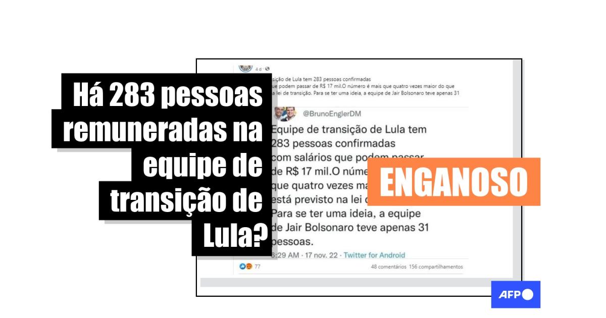 “Equipe de transição de Lula tem 283 pessoas confirmadas com salários que podem passar de R$ 17 mil. O número é mais que quatro vezes maior do que está previsto na lei de transição. Para se ter uma ideia, a equipe de Jair Bolsonaro teve apenas 31 pessoas”, diz uma das publicações que circulam no Twitter, Facebook e Instagram.