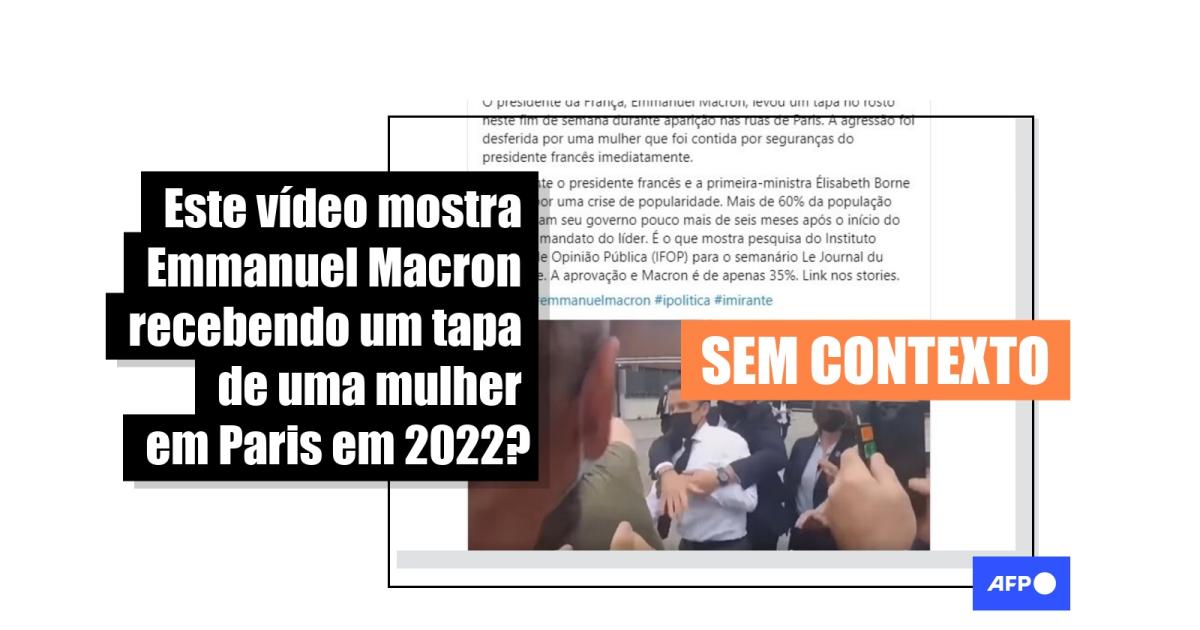 “O presidente da França, Emmanuel Macron, levou um tapa no rosto neste fim de semana durante aparição nas ruas de Paris. A agressão foi desferida por uma mulher que foi contida por seguranças do presidente francês imediatamente”, afirma uma das publicações compartilhadas no Facebook.