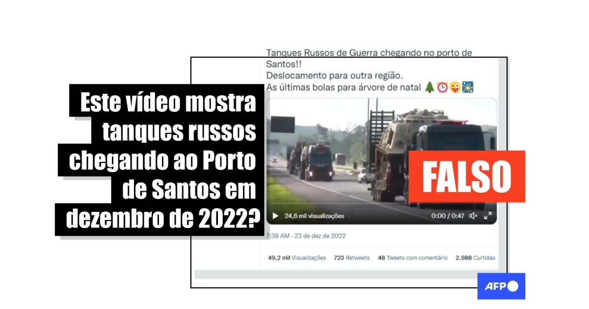 “Tanques Russos de Guerra chegando no porto de Santos!! Deslocamento para outra região. As últimas bolas para árvore de natal”, diz uma das publicações compartilhadas no Twitter. O conteúdo circula também no Facebook, no TikTok e no Kwai, com maior duração.