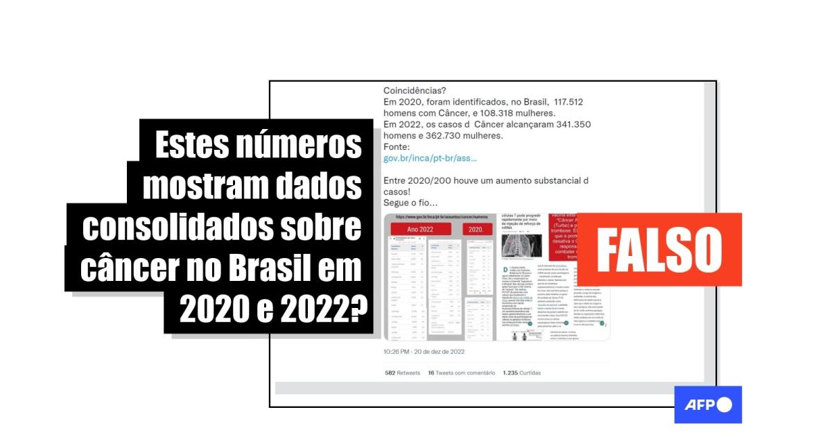 “Coincidências? Em 2020, foram identificados, no Brasil, 117.512 homens com Câncer, e 108.318 mulheres. Em 2022, os casos de Câncer alcançaram 341.350 homens e 362.730 mulheres”, assinala uma postagem no Twitter. Em publicações no Telegram, Facebook e Instagram os mesmos números são creditados a mortes pela doença.