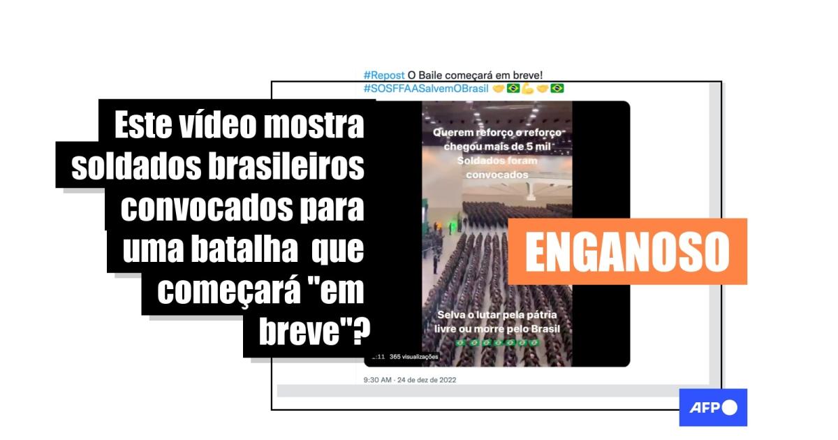 A alegação é compartilhada junto a um vídeo de pouco mais de um minuto com as frases sobrepostas: “Querem reforço o reforço chegou mais de 5 mil soldados foram convocados” e “selva ou lutar pela pátria livre ou morre pelo Brasil”.