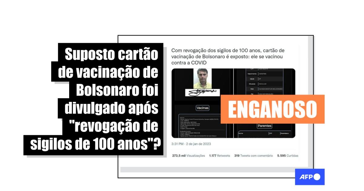 “Com revogação dos sigilos de 100 anos, cartão de vacinação de Bolsonaro é exposto: ele se vacinou contra a COVID”, dizem publicações no Twitter e no Facebook, acompanhadas por uma suposta prova de que o ex-presidente Jair Bolsonaro teria se vacinado contra a covid-19.