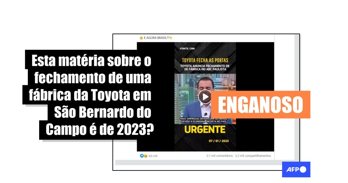 “Toyota anuncia fechamento de fábrica no ABC Paulista. Mais empresas devem sair do Brasil devido a economia incerta no país”, diz o texto sobreposto ao vídeo, compartilhado mais de 20 mil vezes no Facebook, no Twitter e no Kwai. No rodapé da imagem aparece a data “07/01/2023”.