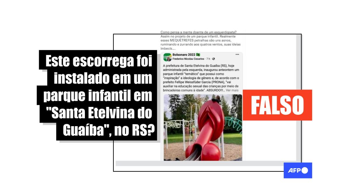 Um escorrega em formato de órgãos genitais foi instalado temporariamente em um set de filmagens no Canadá, não em um parque infantil no Brasil, como sugerem publicações. Após as eleições de 2022 e a eleição de Luiz Inácio Lula da Silva (PT), usuários vinculam a estrutura a “petralhas” e afirmam que ela teria sido construída pela administração “hoje de esquerda” de “Santa Etelvina do Guaíba”, no Rio Grande do Sul. Mas o estado não tem nenhuma cidade com esse nome.