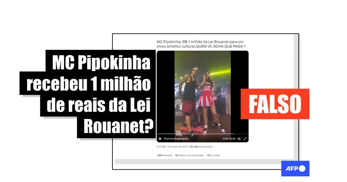 “MC Pipokinha, R$ 1 milhão da Lei Rouanet para um show artístico cultural. QUEM VC ACHA QUE PAGA?”, diz uma publicação com mais de 400 compartilhamentos no Twitter. Outras alegações semelhantes circulam no Facebook, no Kwai e no LinkedIn.
